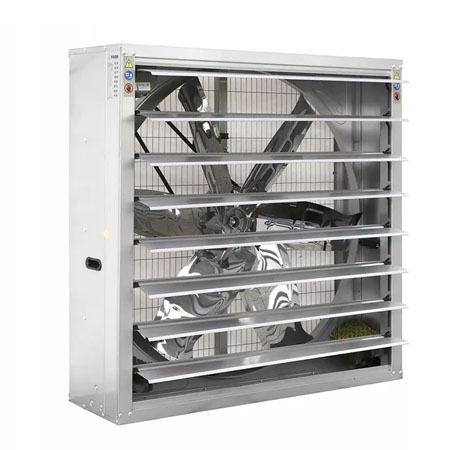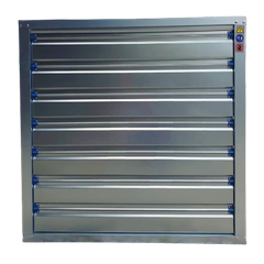 4. Cửa chớp Quạt công nghiệp vuông: Được sử dụng tôn kẽm sáng bóng, cơ cấu búa thả đóng-mở giúp quạt đóng và mở các cửa lá được hoàn toàn. Góc mở 900 được duy trì để đảm bảo các cửa lá chắn được gió, mưa và bụi.