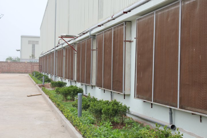 Hình ảnh quạt thông gió công nghiệp lắp đặt kết hợp tấm làm mát cooling pad